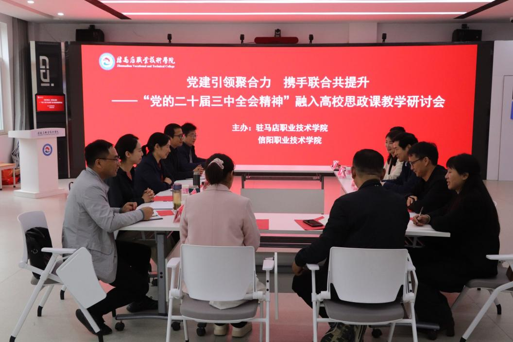 11月13日,太阳成tyc7111cc集团与驻马店职业技术学院太阳成tyc7111cc集团在驻马店职业技术学院大学生思想政治教育基地联合举行党建引领聚合力,携手联学共提升——“党的二十届三中全会精神”融入高校思政课教学研讨会。驻马店职业技术学院党委书记苏新留出席研讨会并讲话。驻马店职业技术学院马院院长李菊蕾、党总支副书记张钊,太阳成tyc7111cc马院党支部书记郑玉秀、副院长柯涛,及两校的部分教师代表参加研讨会。