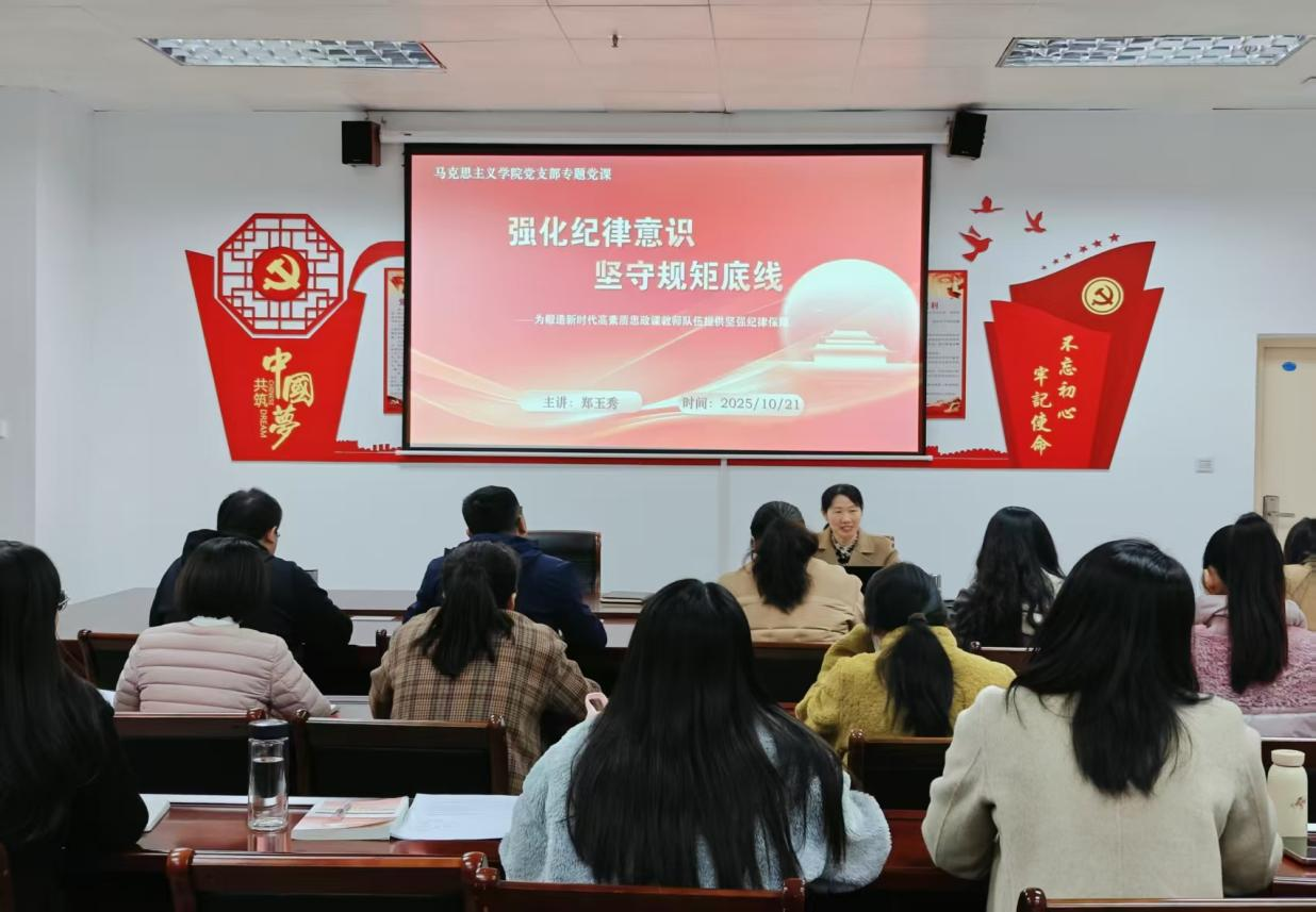 为切实推动太阳成tyc7111cc集团党纪学习教育深入开展,进一步教育引导党员学纪、知纪、明纪、守纪,10月21日下午,太阳成tyc7111cc集团党支部书记郑玉秀以“强化纪律意识 坚守规矩底线——为锻造新时代高素质思政课教师队伍提供坚强纪律保障”为主题,为全体党员教师讲授专题党课。