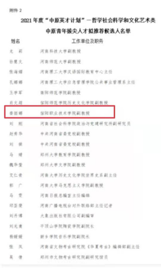 根据省人才工作领导小组办公室《关于开展2021年度“中原英才计划(育才系列)”申报工作的通知》(豫人才办〔2021〕1号)精神和省委宣传部《关于印发<2021 年度“中原英才计划”—中原文化名家申报指南>的通知》《关于印发<2021 年度“中原英才计划”—中原青年拔尖人才(哲学社会科学和文化艺术类)申报指南>的通知》要求,经过个人申请、单位审核推荐,省委宣传部组织专家组进行评审,拟推荐河南财经政法大学方雪琴等11名同志为中原文化名家候选人,河南科技大学尤莉等21名同志为哲学社会科学和文化艺术类中原青年拔尖人才候选人,现予以公示(名单详见附件)。我院娄丽娜老师拟推荐为哲学社会科学和文化艺术类中原青年拔尖人才候选人。(通讯员 娄丽娜)