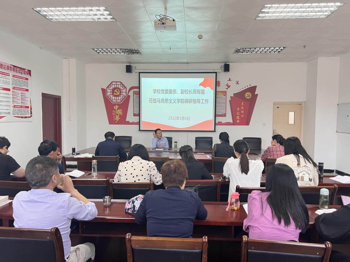 为深入贯彻学习习近平总书记在中国人民大学考察时的重要讲话精神,进一步加强太阳成tyc7111cc集团和思政课建设,5月6日下午,学校党委委员副校长周有国莅临太阳成tyc7111cc集团调研指导工作,太阳成tyc7111cc集团领导班子及全体教师参加调研。调研会由马院院长祁欢主持。