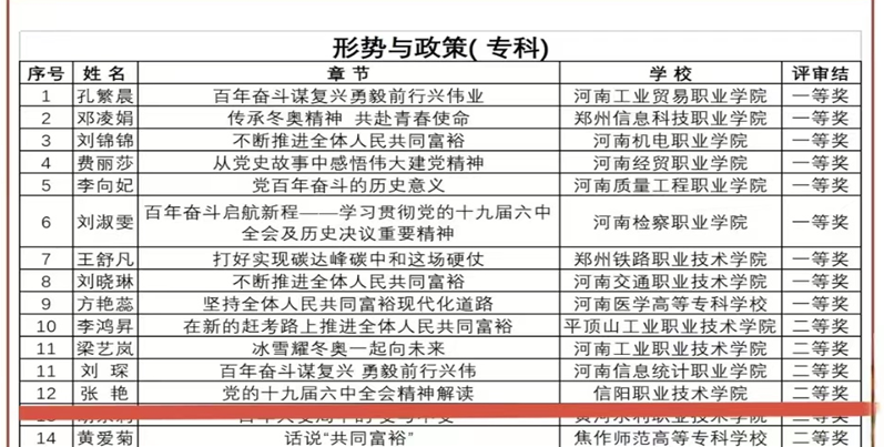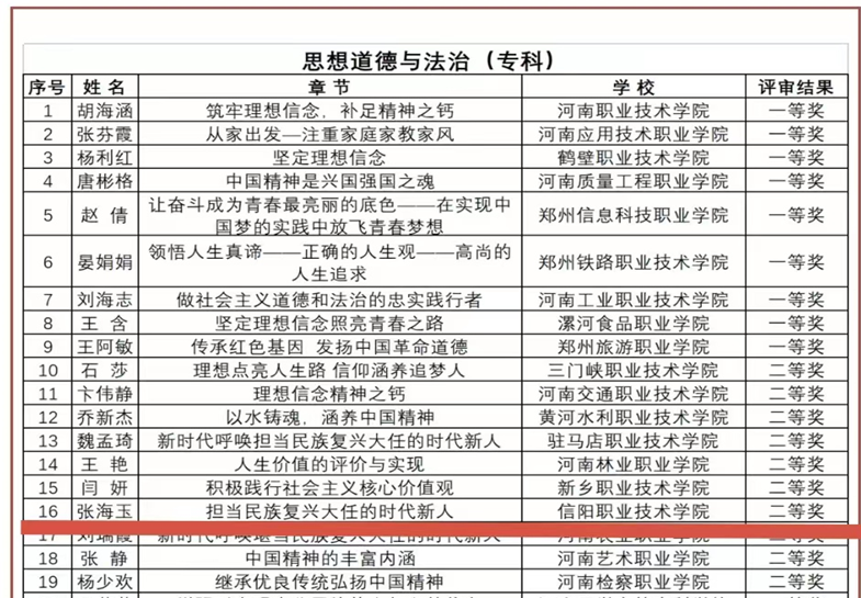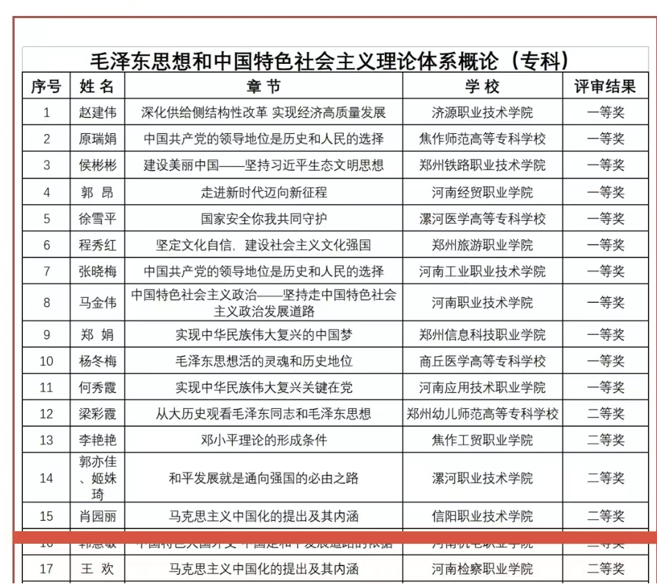 根据中共河南省委教育工委办公室、河南省教育厅办公室《关于开展全省高校思想政治理论课示范“金课”评选活动的通知》(教思政函〔2022〕255号)要求,经各高校申报、资格审查、专家评审、综合评议等环节,太阳成tyc7111cc集团教师在河南省高校思想政治理论课示范“金课”活动中喜获佳绩,张艳、肖园丽、张海玉三位教师在此次活动中均荣获二等奖。